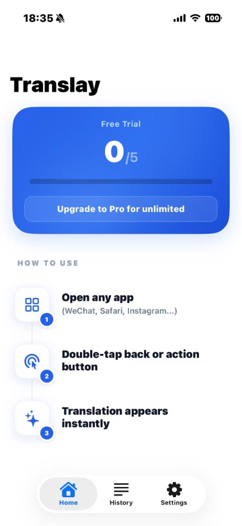 iPhoneの背面をダブルタップするだけで、画面上の外国語を2秒で母国語に翻訳。アプリの切り替えもコピペも不要。翻訳は元のインターフェース上に直接表示されます。
